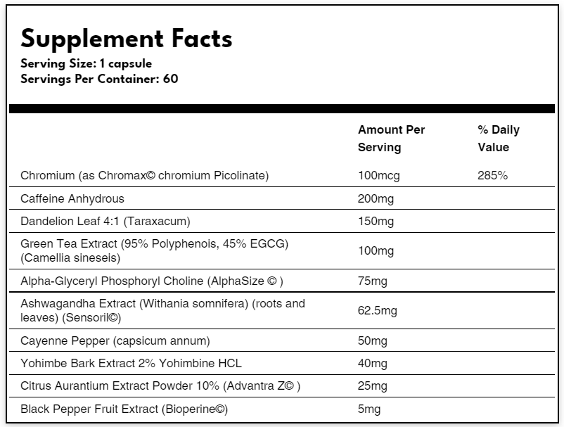 • Fully dosed thermogenic ingredients that include caffeine, cayenne pepper, & green tea, yohimbe bark & bitter orange extracts